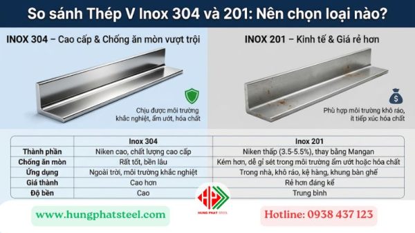 A: Thép V inox 304 có hàm lượng Niken cao hơn, mang lại khả năng chống ăn mòn vượt trội và độ bền tốt hơn, phù hợp cho môi trường ẩm ướt, hóa chất. Thép V inox 201 có hàm lượng Niken thấp hơn, giá thành rẻ hơn nhưng khả năng chống ăn mòn kém hơn, thích hợp cho các ứng dụng nội thất, môi trường khô ráo, ít yêu cầu về chống gỉ sét và có ngân sách hạn chế.
